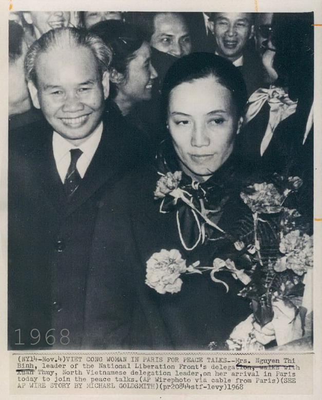 Bộ trưởng Ngoại giao Chính phủ Cách mạng lâm thời Cộng hòa miền Nam Việt Nam Nguyễn Thị Bình và trưởng đoàn đàm phán của Chính phủ Việt Nam dân chủ Cộng hòa Xuân Thủy trong những ngày đầu của Hòa đàm Paris, 1968.